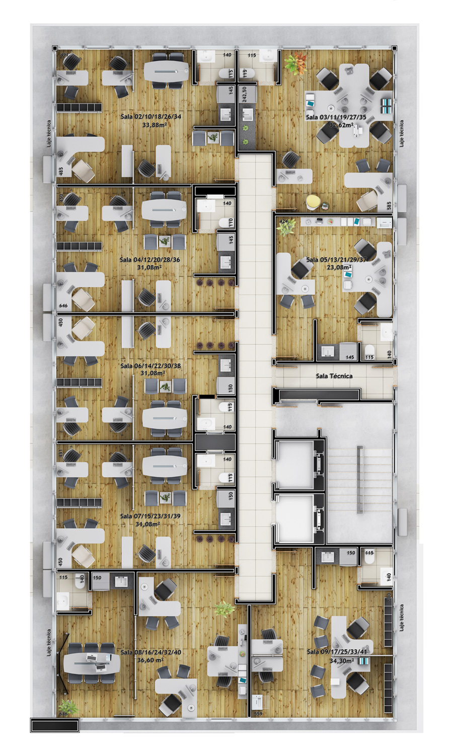 Salas com área privativa de 23.03m² a 253.72m².